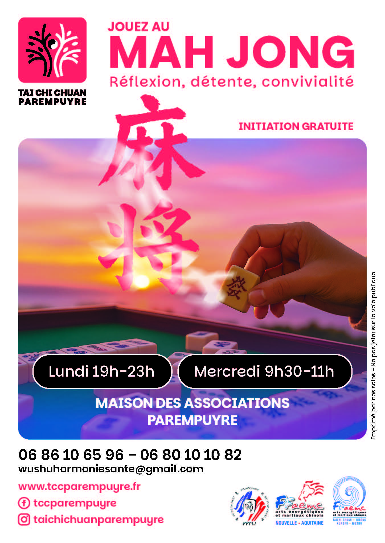 Le MAH-JONG vous attend : le lundi de 19h à 23h et le mercredi de 9h à 11h (sur rendez-vous le mercredi), à la Maison des Associations de Parempuyre, 16 rue des Palus, 33290 PAREMPUYRE.